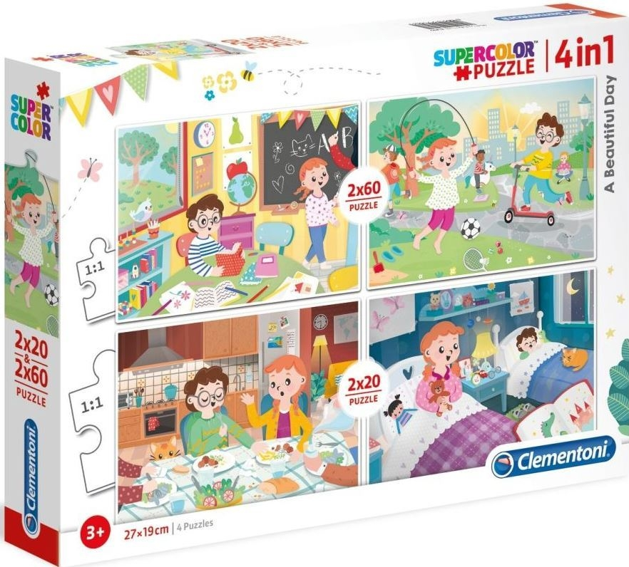 Clementoni 4 in 1 Supercolor πάζλ 2×20 και 2×60 A Beautiful Day 2 πάζλ των 60 τμχ μαζί με 2 πάζλ των 20 τμχ Διαστάσεις κάθε πάζλ:27×19 εκ