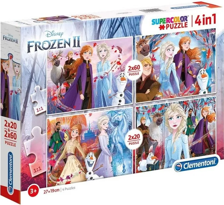 Παζλ 2×20 + 2×60 Super Color Clementoni Frozen 2 Διαστάσεις παζλ: 27 x 19 εκ. Κομμάτια: 4 παζλ τα 2 με 20 κομμάτια και τα άλλα 2 με 60 κομμάτια το καθένα