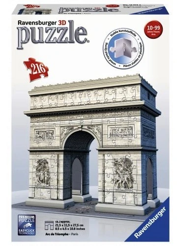 Έλα μαζί μας σε μια περιπέτεια τρίτης διάστασης! Με τα 3D Puzzle της Ravensburger τα διασημότερα μνημεία είναι στα… χέρια σου! Με πλαστικά κλικαριστά κομμάτια που ενώνονται τέλεια μεταξύ τους για να σχηματίσουν ένα σταθερό κτίριο. Η τεχνολογία Easyclick εγγυάται την απόλαυση στο puzzle από την αρχή ως το τέλος! Δεν απαιτείται η χρήση κόλλας. Απέκτησε και εσύ τη δική σου μοναδική Αψίδα του Θριάμβου!