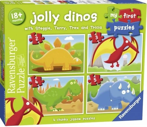 Παζλ Ravensburger χαρούμενοι δεινόσαυροι με 2/3/4/5 κομμάτια. 4 φωτεινά και πολύχρωμα παζλ, ειδικά σχεδιασμένα για παιδιά ηλικίας 18 μηνών και άνω. Κάθε παζλ έχει σχεδιαστεί με μεγάλη προσοχή και λεπτομέρεια, ώστε τα παιδιά να μπορέσουν έυκολα να συνδέσουν τα κομμάτια και να νιώσουν περήφανα για τον εαυτό τους.