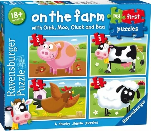 Παζλ Ravensburger φάρμα με 2/3/4/5 κομμάτια. 4 φωτεινά και πολύχρωμα παζλ, ειδικά σχεδιασμένα για παιδιά ηλικίας 18 μηνών και άνω. Κάθε παζλ έχει σχεδιαστεί με μεγάλη προσοχή και λεπτομέρεια, ώστε τα παιδιά να μπορέσουν έυκολα να συνδέσουν τα κομμάτια και να νιώσουν περήφανα για τον εαυτό τους.