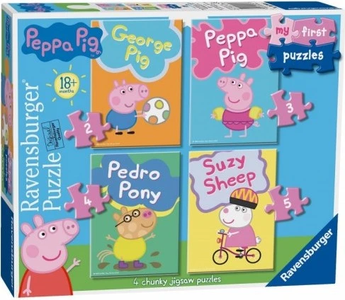 Παζλ Ravensburger Πέππα το γουρουνάκι με 2/3/4/5 κομμάτια. 4 φωτεινά και πολύχρωμα παζλ, ειδικά σχεδιασμένα για παιδιά ηλικίας 18 μηνών και άνω. Κάθε παζλ έχει σχεδιαστεί με μεγάλη προσοχή και λεπτομέρεια, ώστε τα παιδιά να μπορέσουν έυκολα να συνδέσουν τα κομμάτια και να νιώσουν περήφανα για τον εαυτό τους.