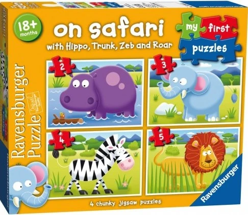 Παζλ Ravensburger στο σαφάρι με 2/3/4/5 κομμάτια. 4 φωτεινά και πολύχρωμα παζλ, ειδικά σχεδιασμένα για παιδιά ηλικίας 18 μηνών και άνω. Κάθε παζλ έχει σχεδιαστεί με μεγάλη προσοχή και λεπτομέρεια, ώστε τα παιδιά να μπορέσουν έυκολα να συνδέσουν τα κομμάτια και να νιώσουν περήφανα για τον εαυτό τους.