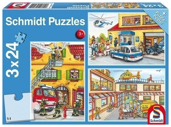 Puzzle Schmidt Πυροσβεστική και Αστυνομία Παζλ για παιδιά με όμορφη εικονογράφηση. •3 παζλ x 24 κομμάτια •Διαστάσεις Puzzle: 26 εκ. x 18 εκ.