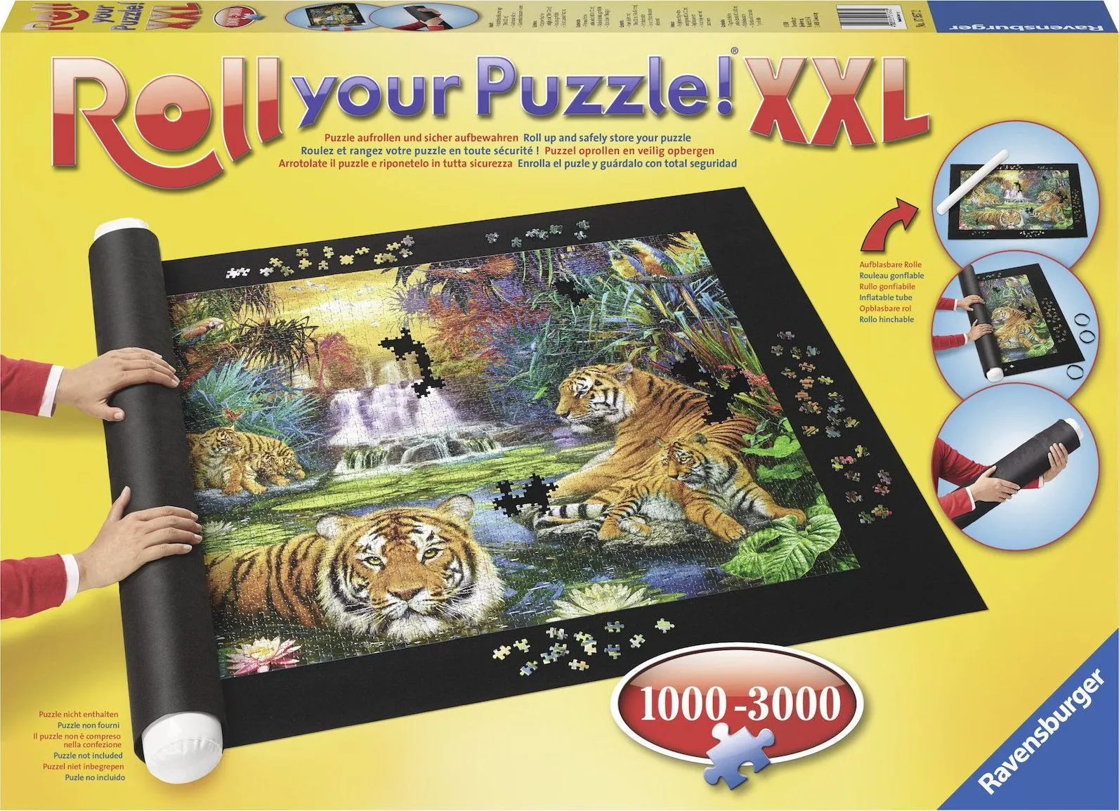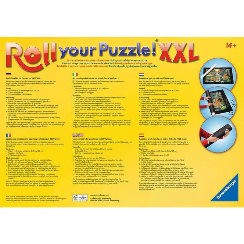 Ravensuburger Roll Your Puzzle XXL Βάση αποθήκευσης ημιτελών και έτοιμων παζλ 1000-3000 τεμαχίων Υλικό: Τσόχα Η συσκευασία περιλαμβάνει: συναρμολογούμενος πλαστικός σωλήνας, τσόχα, λαστιχάκια Διαστάσεις: 150×100εκ.